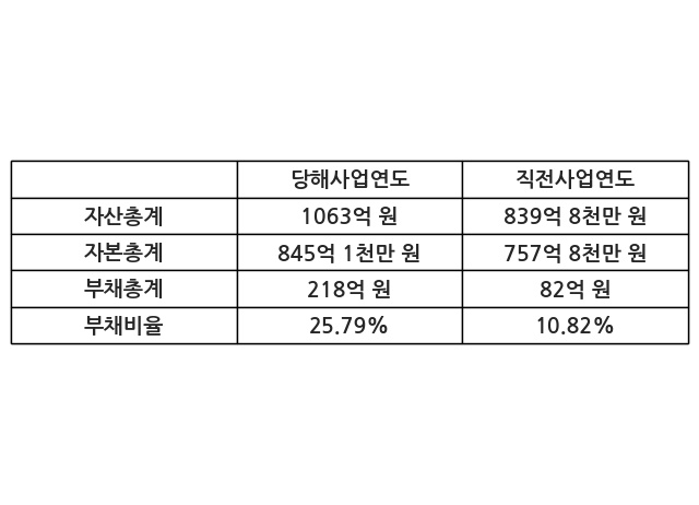 또한, 이번사업연도의 자산총계는 1063억 원으로 직전사업연도 대비 26.58% 증가한 한편, 부채총계는 218억 원으로 165.88% 증가, 자본총계는 845억 1천만 원으로 11.51% 증가했다.