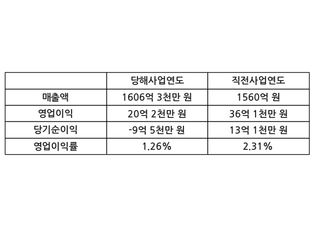 이번사업연도의 매출액은 직전사업연도 대비 2.97% 증가한 1606억 3천만 원, 영업이익은 20억 2천만 원, 당기순이익은 -9억 5천만 원이라고 공시했다.
