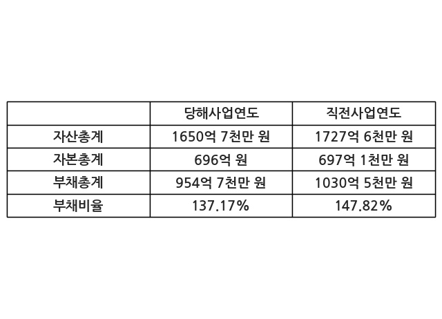 또한, 이번사업연도의 자산총계는 1650억 7천만 원으로 직전사업연도 대비 -4.45% 감소한 한편, 부채총계는 954억 7천만 원으로 -7.36% 감소, 자본총계는 696억 원으로 -0.16% 감소했다.
