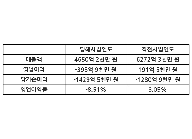 이번사업연도의 매출액은 직전사업연도 대비 -25.86% 감소한 4650억 2천만 원, 영업이익은 -395억 9천만 원, 당기순이익은 -1429억 5천만 원이라고 공시했다.
