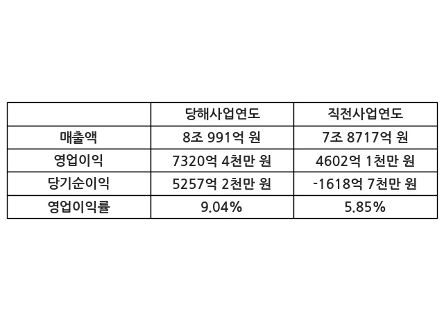 이번사업연도의 매출액은 직전사업연도 대비 2.89% 증가한 8조 991억 원, 영업이익은 7320억 4천만 원, 당기순이익은 5257억 2천만 원이라고 공시했다.