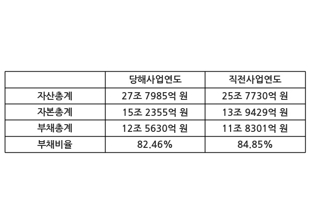 또한, 이번사업연도의 자산총계는 27조 7985억 원으로 직전사업연도 대비 7.86% 증가한 한편, 부채총계는 12조 5630억 원으로 6.19% 증가, 자본총계는 15조 2355억 원으로 9.27% 증가했다.