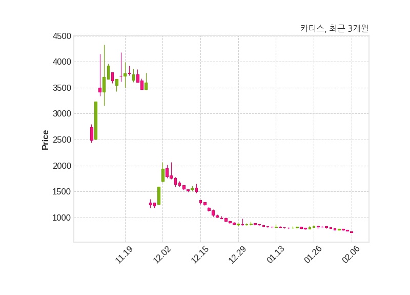 한편, 카티스의 14시 18분 현재주가는 713원으로 직전 거래일 대비 27원(-3.65%) 하락이며, 거래량은 494,281주이다.