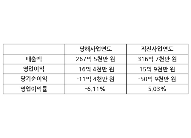 이번사업연도의 매출액은 직전사업연도 대비 -15.54% 감소한 267억 5천만 원, 영업이익은 -16억 4천만 원, 당기순이익은 -11억 4천만 원이라고 공시했다.