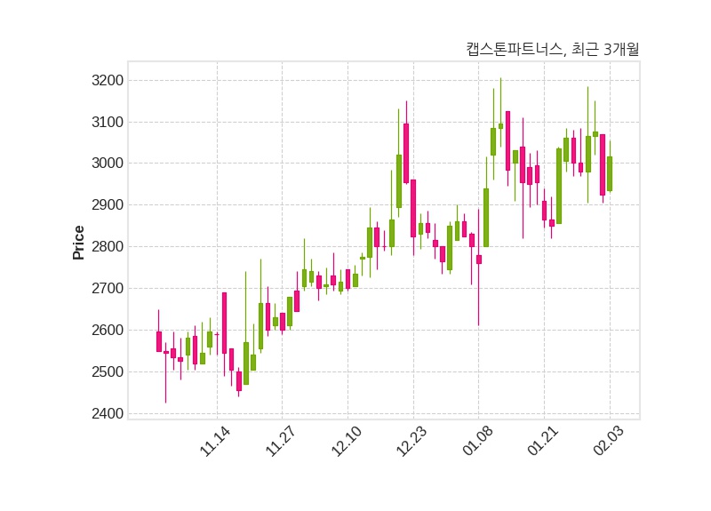 한편, 캡스톤파트너스는 장 마감 이후 해당 기업공시를 발표했으며 오늘 종가가 3,015원, 거래량은 83,488주로, 직전 거래일 대비 90원(+3.08%) 상승했다.