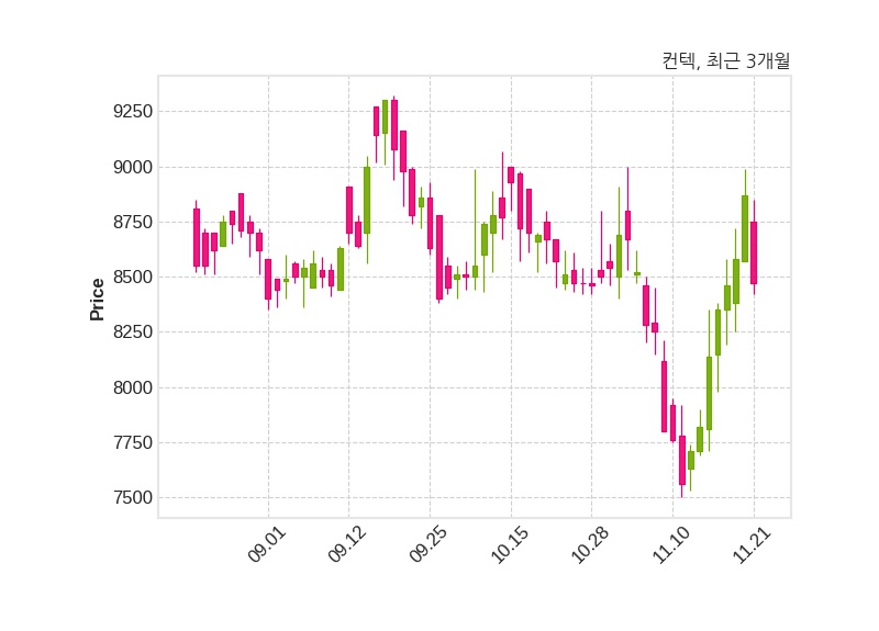 한편, 컨텍은 장 마감 이후 해당 기업공시를 발표했으며 오늘 종가가 8,470원, 거래량은 22,608주로, 직전 거래일 대비 400원(-4.51%) 하락했다.