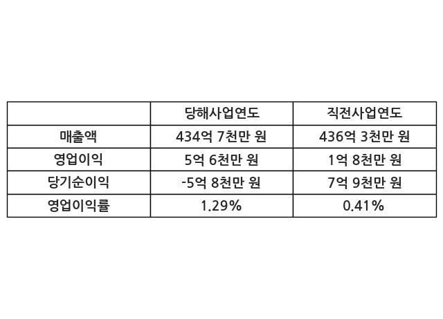 이번사업연도의 매출액은 직전사업연도 대비 -0.35% 감소한 434억 7천만 원, 영업이익은 5억 6천만 원, 당기순이익은 -5억 8천만 원이라고 공시했다.