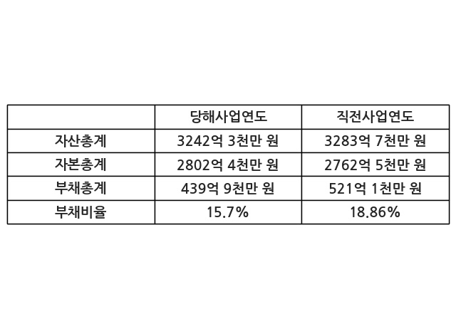또한, 이번사업연도의 자산총계는 3242억 3천만 원으로 직전사업연도 대비 -1.26% 감소한 한편, 부채총계는 439억 9천만 원으로 -15.58% 감소, 자본총계는 2802억 4천만 원으로 1.44% 증가했다.