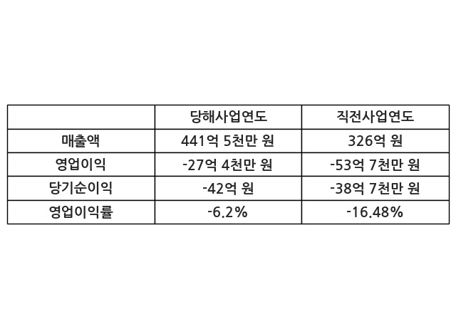이번사업연도의 매출액은 직전사업연도 대비 35.43% 증가한 441억 5천만 원, 영업이익은 -27억 4천만 원, 당기순이익은 -42억 원이라고 공시했다.