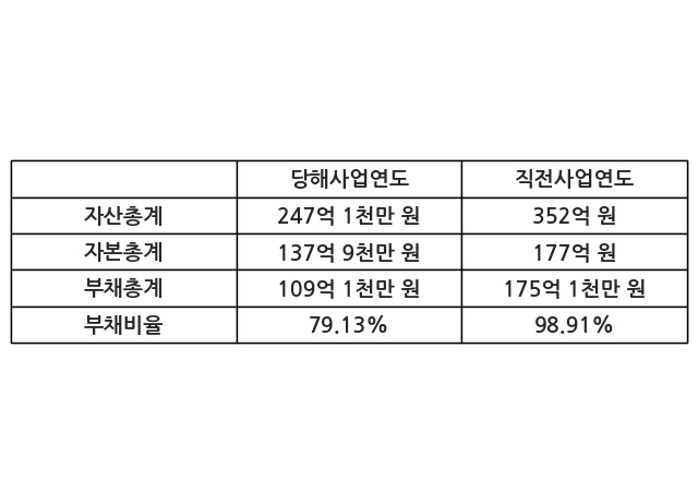 또한, 이번사업연도의 자산총계는 247억 1천만 원으로 직전사업연도 대비 -29.81% 감소한 한편, 부채총계는 109억 1천만 원으로 -37.65% 감소, 자본총계는 137억 9천만 원으로 -22.07% 감소했다.