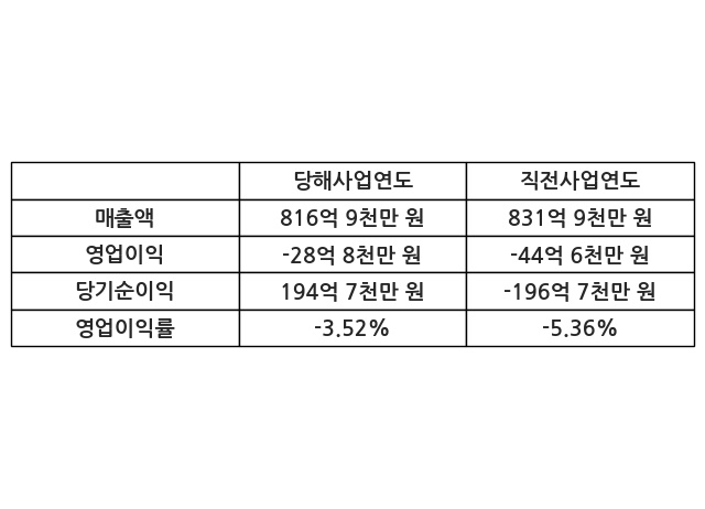 이번사업연도의 매출액은 직전사업연도 대비 -1.79% 감소한 816억 9천만 원, 영업이익은 -28억 8천만 원, 당기순이익은 194억 7천만 원이라고 공시했다.