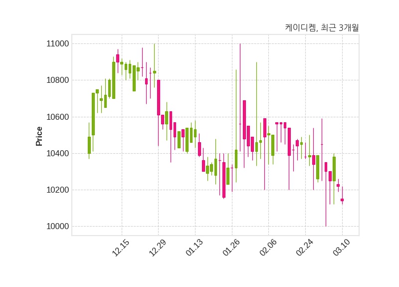 한편, 케이디켐은 장 마감 이후 해당 기업공시를 발표했으며 오늘 종가가 10,140원, 거래량은 957주로, 직전 거래일 대비 80원(-0.78%) 하락했다.
