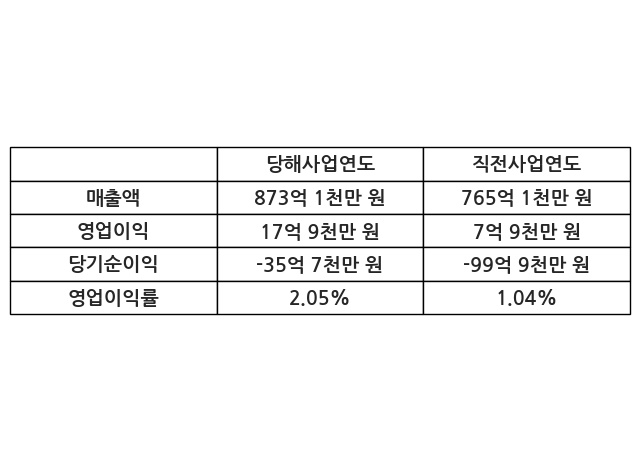 이번사업연도의 매출액은 직전사업연도 대비 14.11% 증가한 873억 1천만 원, 영업이익은 17억 9천만 원, 당기순이익은 -35억 7천만 원이라고 공시했다.