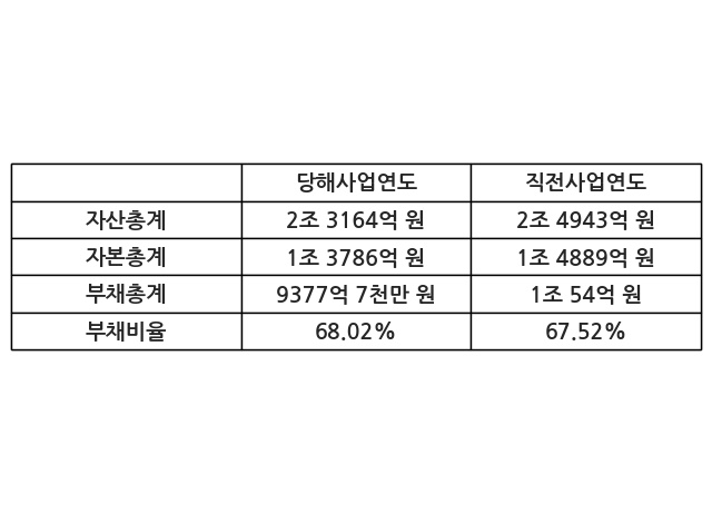 또한, 이번사업연도의 자산총계는 2조 3164억 원으로 직전사업연도 대비 -7.13% 감소한 한편, 부채총계는 9377억 7천만 원으로 -6.72% 감소, 자본총계는 1조 3786억 원으로 -7.41% 감소했다.