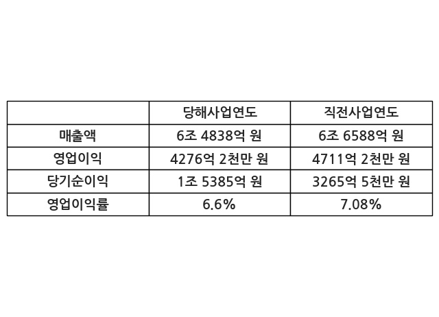 이번사업연도의 매출액은 직전사업연도 대비 -2.63% 감소한 6조 4838억 원, 영업이익은 4276억 2천만 원, 당기순이익은 1조 5385억 원이라고 공시했다.