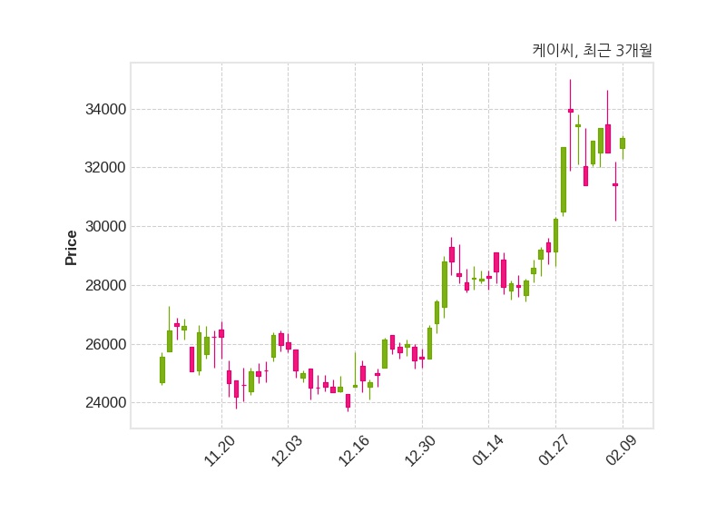 한편, 케이씨는 장 마감 이후 해당 기업공시를 발표했으며 오늘 종가가 33,000원, 거래량은 39,939주로, 직전 거래일 대비 1,600원(+5.1%) 상승했다.