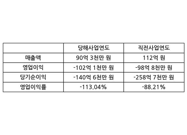이번사업연도의 매출액은 직전사업연도 대비 -19.32% 감소한 90억 3천만 원, 영업이익은 -102억 1천만 원, 당기순이익은 -140억 6천만 원이라고 공시했다.