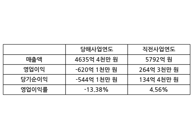 이번사업연도의 매출액은 직전사업연도 대비 -19.97% 감소한 4635억 4천만 원, 영업이익은 -620억 1천만 원, 당기순이익은 -544억 1천만 원이라고 공시했다.