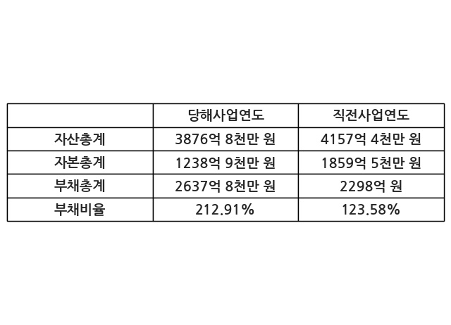 또한, 이번사업연도의 자산총계는 3876억 8천만 원으로 직전사업연도 대비 -6.75% 감소한 한편, 부채총계는 2637억 8천만 원으로 14.79% 증가, 자본총계는 1238억 9천만 원으로 -33.37% 감소했다.