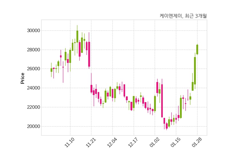 한편, 케이엔제이는 장 마감 이후 해당 기업공시를 발표했으며 오늘 종가가 28,500원, 거래량은 390,723주로, 직전 거래일 대비 1,300원(+4.78%) 상승했다.
