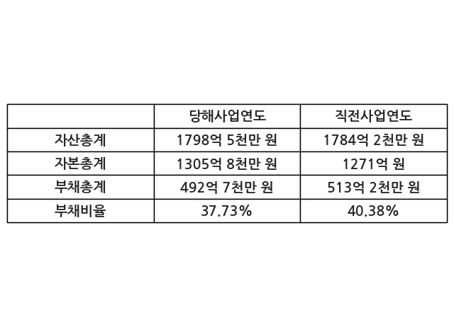 또한, 이번사업연도의 자산총계는 1798억 5천만 원으로 직전사업연도 대비 0.8% 증가한 한편, 부채총계는 492억 7천만 원으로 -3.99% 감소, 자본총계는 1305억 8천만 원으로 2.73% 증가했다.