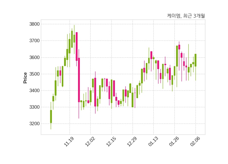 한편, 케이엠은 장 마감 이후 해당 기업공시를 발표했으며 오늘 종가가 3,620원, 거래량은 29,605주로, 직전 거래일 대비 50원(+1.4%) 상승했다.