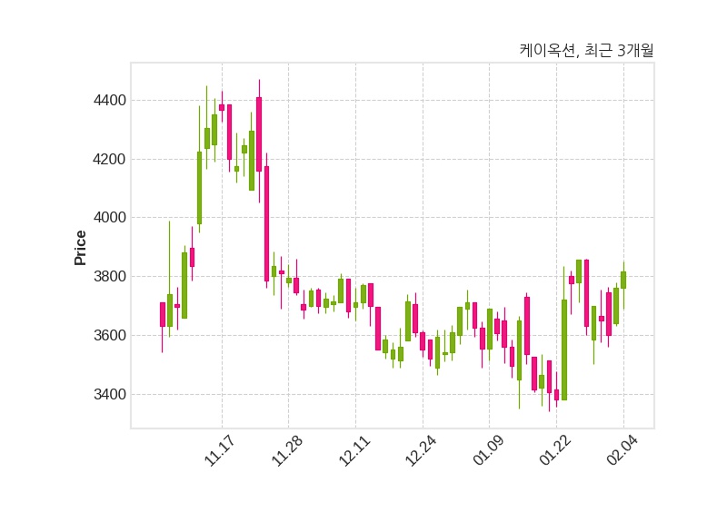 한편, 케이옥션은 장 마감 이후 해당 기업공시를 발표했으며 오늘 종가가 3,815원, 거래량은 94,325주로, 직전 거래일 대비 55원(+1.46%) 상승했다.