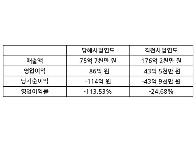 이번사업연도의 매출액은 직전사업연도 대비 -57.01% 감소한 75억 7천만 원, 영업이익은 -86억 원, 당기순이익은 -114억 원이라고 공시했다.