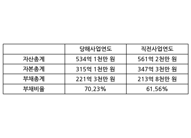또한, 이번사업연도의 자산총계는 534억 1천만 원으로 직전사업연도 대비 -4.83% 감소한 한편, 부채총계는 221억 3천만 원으로 3.5% 증가, 자본총계는 315억 1천만 원으로 -9.27% 감소했다.