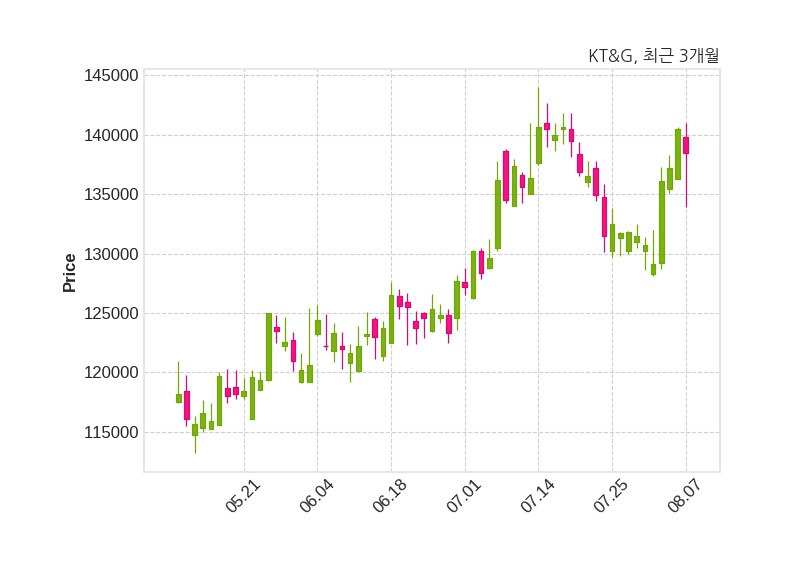 한편, 케이티앤지는 장 마감 이후 해당 기업공시를 발표했으며 오늘 종가가 138,500원, 거래량은 471,431주로, 직전 거래일 대비 2,000원(-1.42%) 하락했다.