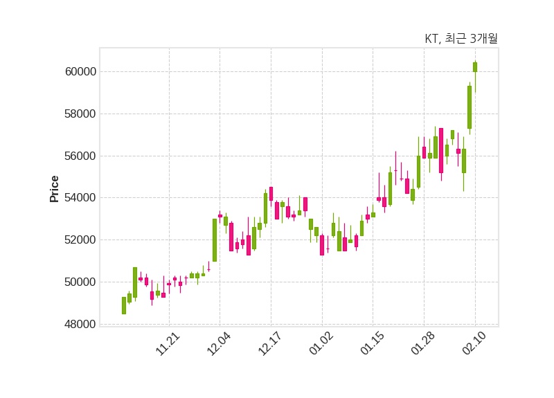 한편, 케이티의 14시 16분 현재주가는 60,400원으로 직전 거래일 대비 1,100원(+1.85%) 상승이며, 거래량은 308,058주이다.