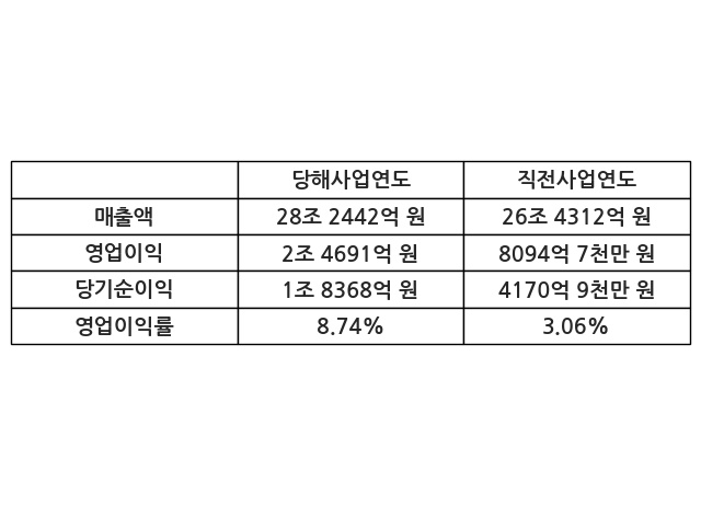 이번사업연도의 매출액은 직전사업연도 대비 6.86% 증가한 28조 2442억 원, 영업이익은 2조 4691억 원, 당기순이익은 1조 8368억 원이라고 공시했다.