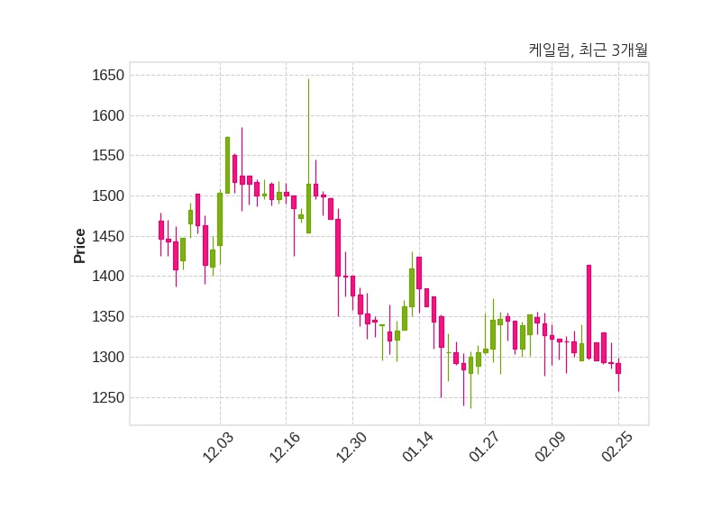 한편, 케일럼은 장 마감 이후 해당 기업공시를 발표했으며 오늘 종가가 1,280원, 거래량은 49,673주로, 직전 거래일 대비 12원(-0.93%) 하락했다.