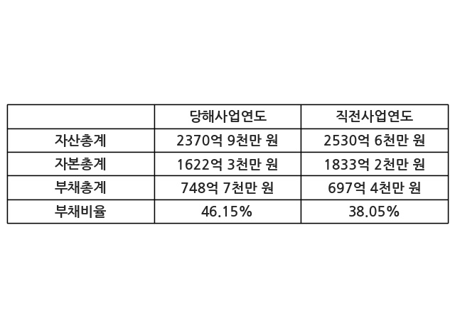 또한, 이번사업연도의 자산총계는 2370억 9천만 원으로 직전사업연도 대비 -6.31% 감소한 한편, 부채총계는 748억 7천만 원으로 7.34% 증가, 자본총계는 1622억 3천만 원으로 -11.5% 감소했다.