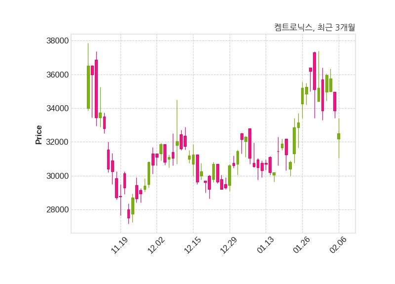 한편, 켐트로닉스는 장 마감 이후 해당 기업공시를 발표했으며 오늘 종가가 32,500원, 거래량은 291,523주로, 직전 거래일 대비 1,350원(-3.99%) 하락했다.
