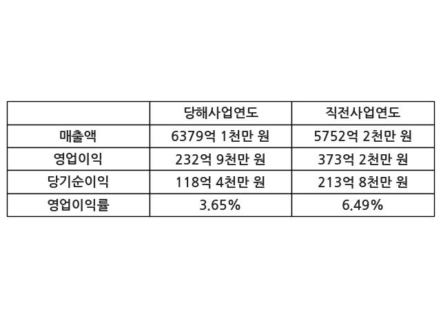 이번사업연도의 매출액은 직전사업연도 대비 10.9% 증가한 6379억 1천만 원, 영업이익은 232억 9천만 원, 당기순이익은 118억 4천만 원이라고 공시했다.