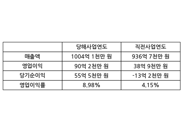 이번사업연도의 매출액은 직전사업연도 대비 7.2% 증가한 1004억 1천만 원, 영업이익은 90억 2천만 원, 당기순이익은 55억 5천만 원이라고 공시했다.