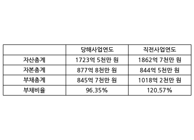 또한, 이번사업연도의 자산총계는 1723억 5천만 원으로 직전사업연도 대비 -7.47% 감소한 한편, 부채총계는 845억 7천만 원으로 -16.94% 감소, 자본총계는 877억 8천만 원으로 3.94% 증가했다.