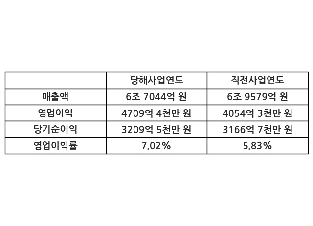 이번사업연도의 매출액은 직전사업연도 대비 -3.64% 감소한 6조 7044억 원, 영업이익은 4709억 4천만 원, 당기순이익은 3209억 5천만 원이라고 공시했다.
