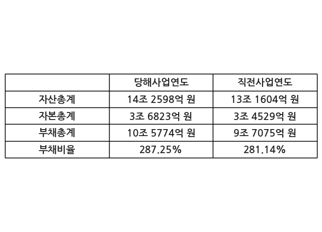 또한, 이번사업연도의 자산총계는 14조 2598억 원으로 직전사업연도 대비 8.35% 증가한 한편, 부채총계는 10조 5774억 원으로 8.96% 증가, 자본총계는 3조 6823억 원으로 6.65% 증가했다.