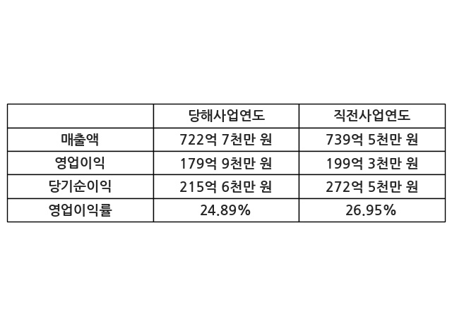 이번사업연도의 매출액은 직전사업연도 대비 -2.26% 감소한 722억 7천만 원, 영업이익은 179억 9천만 원, 당기순이익은 215억 6천만 원이라고 공시했다.