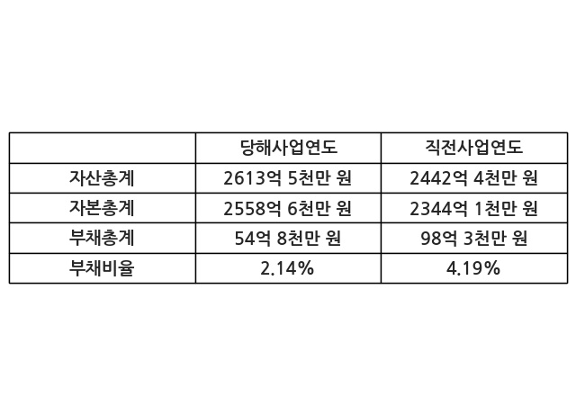 또한, 이번사업연도의 자산총계는 2613억 5천만 원으로 직전사업연도 대비 7.0% 증가한 한편, 부채총계는 54억 8천만 원으로 -44.25% 감소, 자본총계는 2558억 6천만 원으로 9.15% 증가했다.