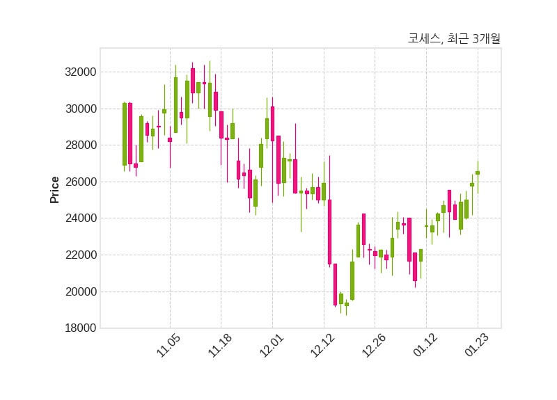 한편, 코세스는 장 마감 이후 해당 기업공시를 발표했으며 오늘 종가가 26,550원, 거래량은 291,513주로, 직전 거래일 대비 650원(+2.51%) 상승했다.
