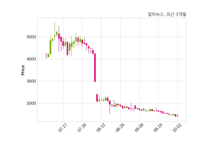한편, 알파녹스는 장 마감 이후 해당 기업공시를 발표했으며 오늘 종가가 1,419원, 거래량은 147,359주로, 직전 거래일 대비 4원(+0.28%) 상승했다.