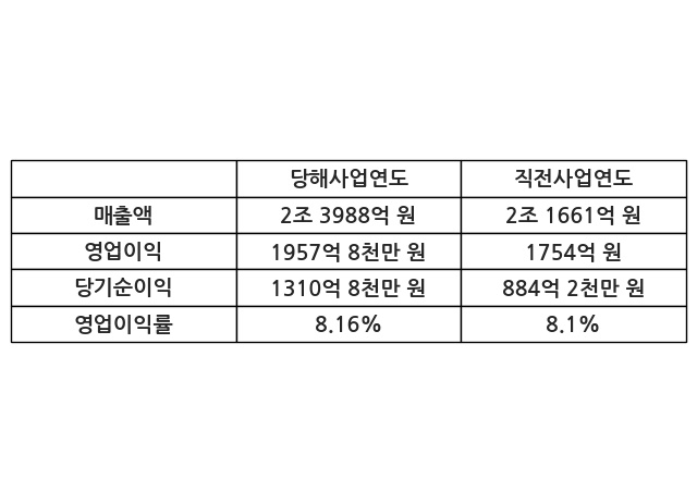 이번사업연도의 매출액은 직전사업연도 대비 10.74% 증가한 2조 3988억 원, 영업이익은 1957억 8천만 원, 당기순이익은 1310억 8천만 원이라고 공시했다.
