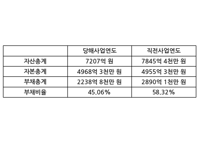 또한, 이번사업연도의 자산총계는 7207억 원으로 직전사업연도 대비 -8.14% 감소한 한편, 부채총계는 2238억 8천만 원으로 -22.54% 감소, 자본총계는 4968억 3천만 원으로 0.26% 증가했다.
