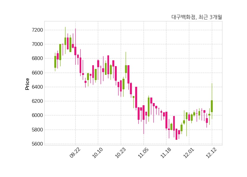 한편, 대구백화점의 10시 12분 현재주가는 6,210원으로 직전 거래일 대비 190원(+3.16%) 상승이며, 거래량은 10,598주이다.
