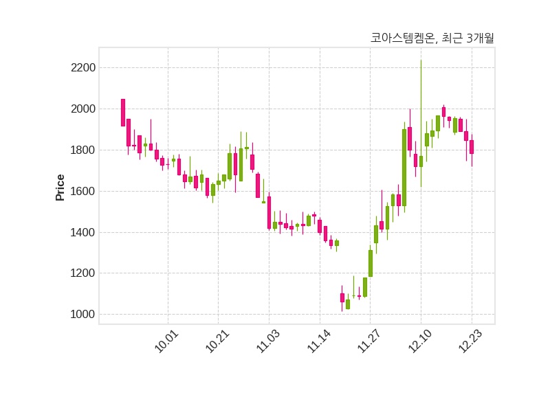 한편, 코아스템켐온은 장 마감 이후 해당 기업공시를 발표했으며 오늘 종가가 1,783원, 거래량은 810,293주로, 직전 거래일 대비 62원(-3.36%) 하락했다.