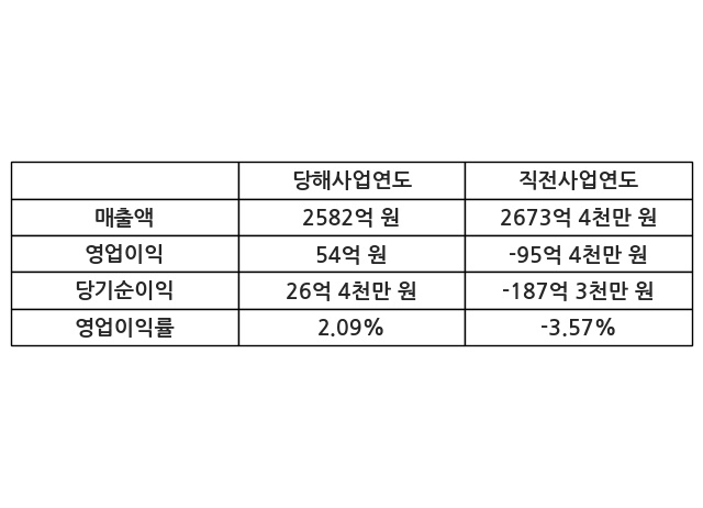 이번사업연도의 매출액은 직전사업연도 대비 -3.42% 감소한 2582억 원, 영업이익은 54억 원, 당기순이익은 26억 4천만 원이라고 공시했다.
