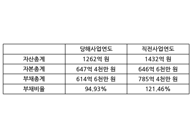 또한, 이번사업연도의 자산총계는 1262억 원으로 직전사업연도 대비 -11.87% 감소한 한편, 부채총계는 614억 6천만 원으로 -21.74% 감소, 자본총계는 647억 4천만 원으로 0.12% 증가했다.